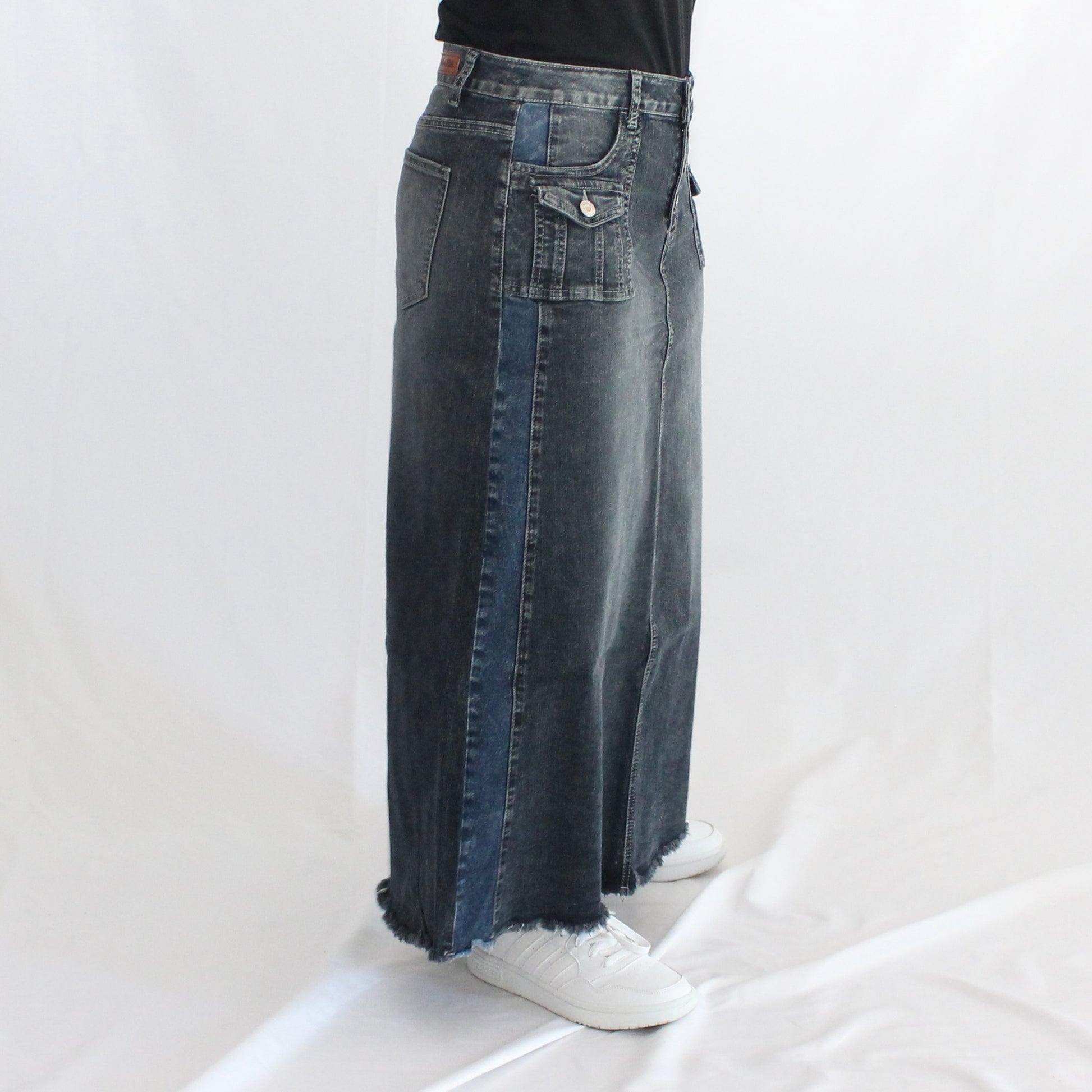 Introducing The Rachel - Long Black Denim Skirt by Be-Girl. With a button fly opening and cargo pockets, this skirt is both stylish and functional. The side contrast denim adds a unique touch, making it perfect for any occasion. Stay modest and on-trend with this long black denim skirt.